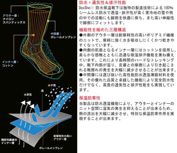 地の雪や雨の中での活動にも脚部を快適に保ち、